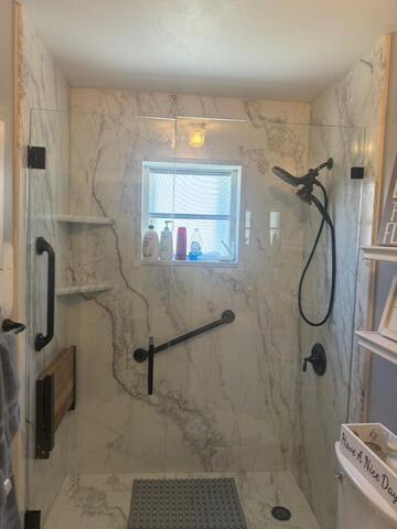 We replaced the tub with a sleek walk-in shower featuring elegant marble-look wall panels, a clear glass sliding door, and a modern handheld showerhead. The addition of integrated corner shelving and a polished grab bar brings both function and safety to the