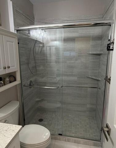 This renovation features a stylish shower upgrade centered around Veincut Gray wall panels in a 10x20 smooth tile pattern, offering a sleek and modern look with the appearance of structured masonry. The project involved a complete plumbing update, replacing the existing valve and fixtures with a high-performance Moen Posi-Temp system and a versatile Moen Magnetix handheld showerhead. For the enclosure, a 59" Chrome Bi-pass sliding door with clear glass was installed, providing a clean, open feel that showcases the sophisticated linear-veined gray palette. The space is further optimized for convenience and organization with the addition of two corner shelves and a dedicated shave step, resulting in a cohesive, contemporary, and highly functional shower environment that significantly upgrades the home's interior.