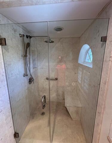 This renovation exemplifies the transformation of an existing shower into a luxurious, spa-like experience, focusing on high-end materials and custom functionality. The Shower-to-Shower conversion centered on replacing the old tile with three walls of elegant Botticino Cream Smooth panels, providing a seamless, sophisticated travertine aesthetic. The space is now defined by a custom Frameless Pivot Door enclosure with clear glass, complemented by a substantial Big Bench and a sleek Recessed Caddy. The plumbing system was fully upgraded with a MOEN POSI-TEMP valve and Brushed Nickel trim, and a 12-inch safety bar was integrated for enhanced security. This comprehensive upgrade delivers a superior custom shower experience with unparalleled elegance and accessibility.