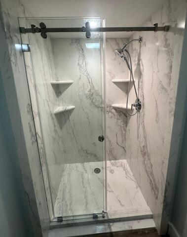 This strategic Shower-to-Shower Conversion revitalized the existing space, focusing on modern elegance and efficiency. The old enclosure was replaced with three walls of breathtaking Everest Smooth panels, providing a crisp, high-contrast marble aesthetic. A new, pristine White Base was installed, establishing a clean foundation for the renovated shower. To maximize cost-efficiency and streamline the project, the original existing valve and existing shower head were skillfully installed, ensuring seamless functionality. The final design incorporates two integrated corner shelves, delivering both a sophisticated new look and enhanced storage.