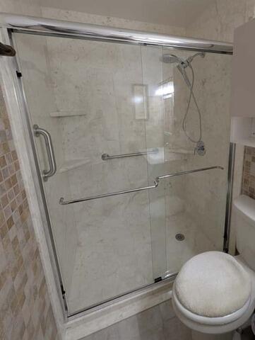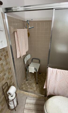 This project features a high-end renovation that revitalized an existing shower space with modern materials and enhanced safety features. The original shower, as seen in the "before" image, consisted of outdated tan square tiles and a standard frosted glass sliding door. Following a Shower to Shower conversion, the space was reimagined using a Botticino Cream color palette in a Smooth style for all three walls, providing a bright and sophisticated marble look. The new installation includes a 58x34 custom shower base with a right-hand drain and a semi-frameless Bypass sliding door system finished in Chrome with Clear glass. For added comfort and accessibility, the remodel was outfitted with three corner shelves and two safety bars (12" and 24"), all complemented by a new Moen Posi-Temp valve and matching Chrome trim.
