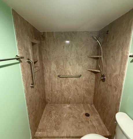 This shower-to-shower renovation introduced a fresh, coastal-inspired aesthetic with smooth Azzurra Bay wall panels installed across three sides. The upgrade included a standard base with a centered drain, paired with a custom frameless glass enclosure featuring brushed nickel hardware and a barn-style door for a sleek, modern finish. Plumbing fixtures were replaced with a Moen Posi-Temp valve and matching brushed nickel trim, enhancing both performance and style. Accessories such as two corner shelves and a shave step were added for convenience, while a window within the shower area allows natural light to brighten the space. The flooring was updated with Akadia luxury vinyl planks, and the customer-supplied vanity and toilet were installed after demo and drywall repair, leaving the area paint-ready. The result is a clean, functional, and visually cohesive bathroom tailored for comfort and elegance.