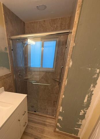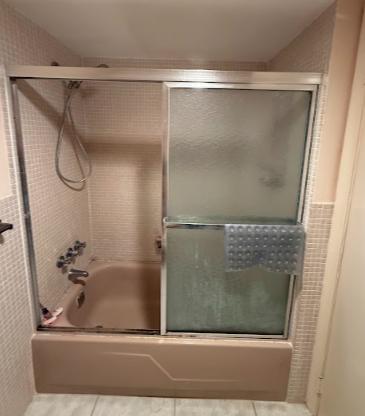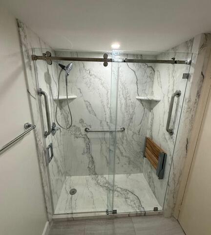 This bathroom underwent a striking transformation, replacing a retro pink tiled tub with a sleek, modern shower. The new enclosure features sliding glass doors and a marble-patterned wall system that extends to the ceiling, creating a clean and elegant atmosphere. A handheld showerhead mounted on a vertical bar offers adjustable comfort, while two built in corner shelves provide practical storage. The brushed nickel fixtures and seamless base enhance both style and safety. This remodel not only updated the aesthetic but also improved accessibility and daily convenience, delivering a fresh, functional space tailored to the homeowner’s needs.