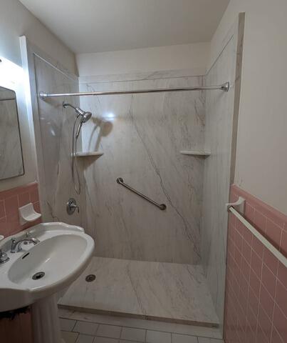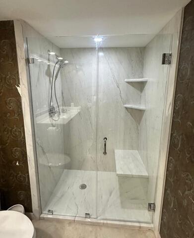 This shower to shower renovation features a low-threshold base with a left-side drain, designed for both accessibility and modern appeal. The walls are finished in smooth Azzurra Bay panels, creating a serene, coastal-inspired atmosphere. A custom frameless glass enclosure with chrome hardware adds elegance and openness to the space. Functional upgrades include a Moen Magnetix handheld showerhead, a built-in bench, and dual corner shelves for convenience. With five wall surfaces and thoughtful accessory placement, this transformation delivers a refined, spa-like experience tailored to the homeowner’s needs.
