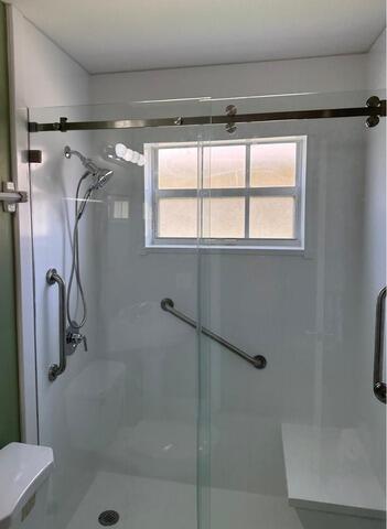 This bathroom transformation involved converting a traditional bathtub into a modern walk-in shower, enhancing both functionality and aesthetics. The new shower features a standard base with a left-side drain, complemented by smooth Azzurra Bay wall panels that bring a serene, coastal tone to the space. Accessibility and comfort were prioritized with the installation of dual safety grab bars, a corner seat, and a semi-frameless sliding glass enclosure in brushed nickel finish. The plumbing was upgraded with a Muen Posi-Temp valve and matching brushed nickel fixtures. Additional enhancements include two corner shelves, a window trim kit, and natural lighting through the existing window, which was preserved and integrated into the design. This remodel showcases a thoughtful blend of safety, style, and practicality tailored to the homeowner’s needs.