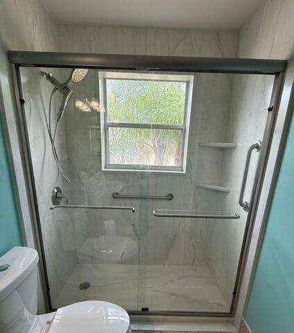 We refreshed the space with a sleek new walk-in shower featuring elegant stone-style wall panels, upgraded corner shelving, a modern hand-held shower head, and new polished chrome hardware. The frameless glass enclosure adds a clean, open feel while still preserving the original footprint — bringing style, functionality, and a touch of luxury to this Miramar home.