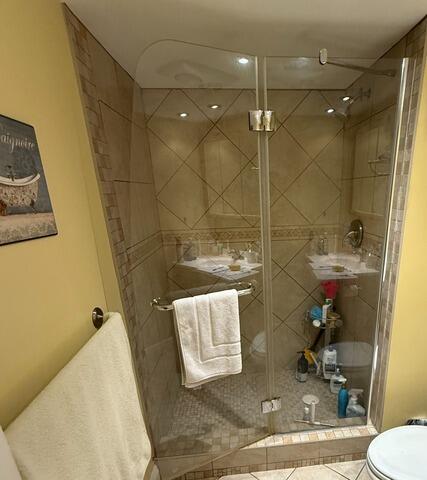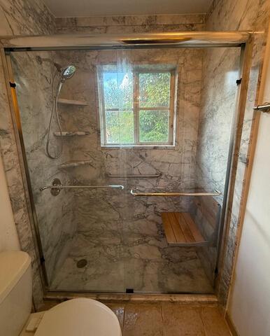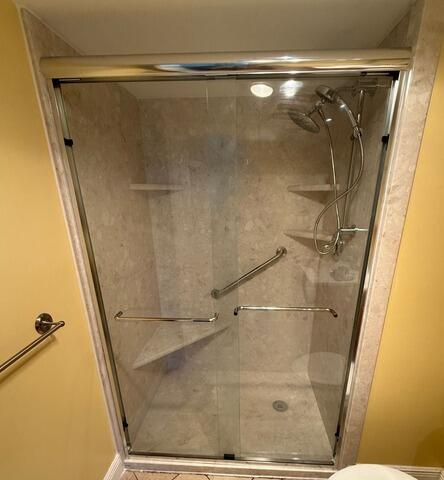 This refined remodel enhances both safety and style, transforming an existing shower into a functional and welcoming space. The new seamless Neo angle base with a right-side drain offers a clean, modern footprint tailored to the bathroom layout. Walls are finished in smooth Calabria panels, adding warmth and sophistication with a natural stone look. A sliding glass enclosure with bi-pass doors and chrome framing creates a sleek, functional entry. The upgraded valve and fixture, including a handheld showerhead with in wall cradle, ensure ease of use and comfort. Accessories include three corner shelves, a corner seat, and a 24" safety bar thoughtfully positioned to support daily routines.