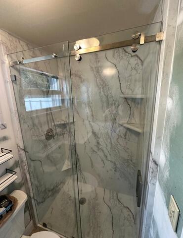 This elegant upgrade enhances both function and style, transforming an existing shower into a refined, spa like retreat. The new low threshold base with a left-side drain offers easy access and a seamless look. Walls are finished in smooth White Pearl panels, complemented by full tile removal and fresh sheetrock preparation for a polished finish. A barn style glass enclosure with brushed nickel hardware adds a modern touch, while the Moen Posi Temp valve and Magnetix-BV trim ensure reliable performance and sleek design. The space is thoughtfully equipped with four corner shelves, a steel shampoo caddy, and a shave step for added convenience. A window at ceiling height brings in natural light, enhancing the open feel. Beyond the shower, the remodel includes a new vanity with solid white gloss top, a tall elongated toilet, and a mirrored medicine cabinet each detail selected to elevate comfort and aesthetics.