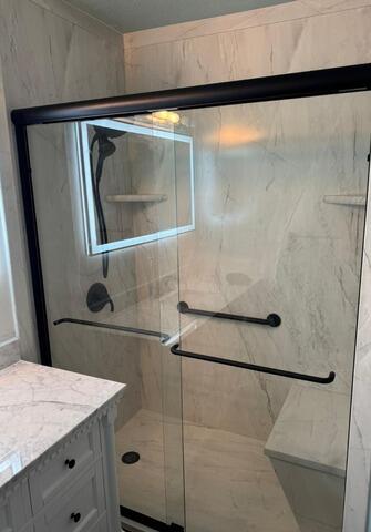 The bathroom was renovated through a shower-to-shower upgrade, replacing the previous setup with a refined and functional design. The new shower features Botticino Cream marble walls in a soft beige tone, adding warmth and elegance to the space. A custom enclosure was installed along with updated chrome fixtures, including a Positempo valve and Magnetix trim. Accessibility features such as a horizontal grab bar, a handheld showerhead, and built-in corner shelves enhance comfort and usability. The transformation blends subtle luxury with everyday practicality, creating a clean and inviting bathing environment.