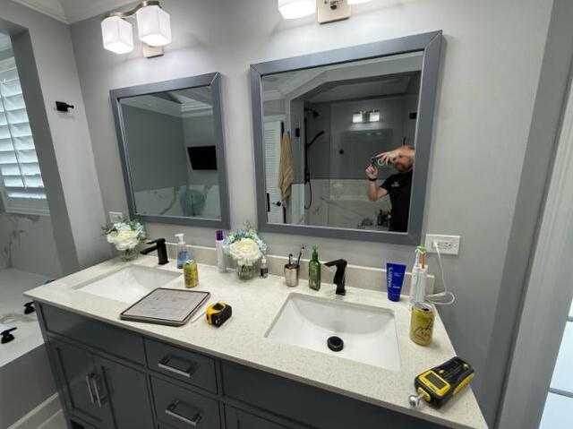 This expansive full bathroom remodel in Deerfield Beach begins with a stunning custom vanity area designed for both impact and elegance. The focal point is a large Birch designer wood vanity finished in a bold Cobalt Blue with a modern Osage door style, perfectly accented by sleek Stainless Steel bar hardware. The vanity is topped with a pristine White Glossy countertop featuring a Double Wave design, and the entire area is beautifully tied together by a new, stunning Whitby White floor. To complete this double station, we installed two matching mirrors illuminated by two Globe Eva light fixtures in a polished Chrome finish, creating a perfectly balanced and vibrant space that sets the tone for the rest of the home.