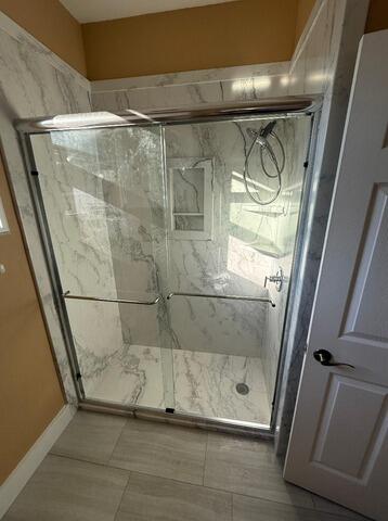 This comprehensive shower to shower renovation in Lake Worth for Paula Politis showcases a stunning transition from a dated, framed enclosure to a high-end, modern retreat. The transformation features a premium Calcutta Gold wall system that provides a luxurious marble aesthetic, perfectly complemented by a custom frameless hinge door system with polished Chrome finish hardware. The upgrade includes a high-performance Moen Magnetix showerhead for a superior experience, along with two integrated corner shelves for a clean, organized look. Beyond the shower, the remodel extends to a full vanity upgrade featuring a Driftwood stain vanity with a centered Wave sink, a matching framed mirror, and a 3 globe chrome light fixture, creating a perfectly cohesive and sophisticated bathroom design.