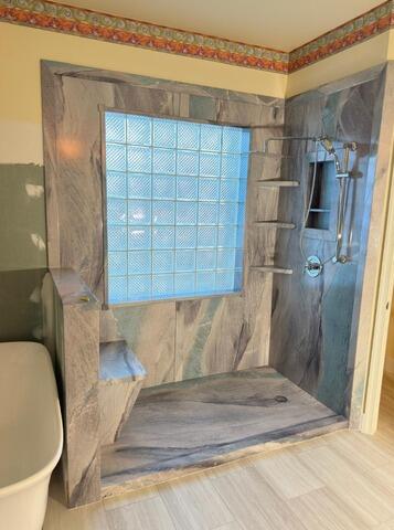 This remodel features a spacious bathtub-to-shower conversion with a custom non-skid shower base, designed for safety and seamless integration. The walls are finished in Everest panels with a smooth texture, extending all the way to the ceiling for a clean, uninterrupted look.