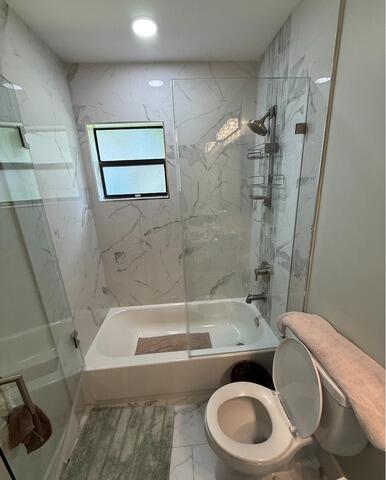 A veteran from Boynton Beach, FL, wanted to remodel his bathroom by converting his tub into a shower. He found us online and trusted us with the project. We removed his old tub and installed a beautiful new shower with matching walls in the Azzurra Bay color. We made sure it was easy and convenient to use by installing a Posi-Temp valve for perfect water temperature and a Moen Magnetix hand-held shower head in brushed nickel. For added storage, we put in four corner shelves and two safety grab bars for extra protection. To complete the look, we installed a custom barn door with a brushed nickel finish. The entire job was done in just one day, and our customer was thrilled with the result. We are proud to serve our military and thank him for his service.