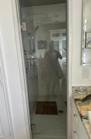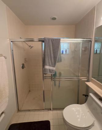 This renovation features a stylish shower upgrade centered around Veincut Gray wall panels in a 10x20 smooth tile pattern, offering a sleek and modern look with the appearance of structured masonry. The project involved a complete plumbing update, replacing the existing valve and fixtures with a high-performance Moen Posi-Temp system and a versatile Moen Magnetix handheld showerhead. For the enclosure, a 59" Chrome Bi-pass sliding door with clear glass was installed, providing a clean, open feel that showcases the sophisticated linear-veined gray palette. The space is further optimized for convenience and organization with the addition of two corner shelves and a dedicated shave step, resulting in a cohesive, contemporary, and highly functional shower environment that significantly upgrades the home's interior.