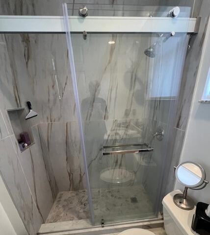 When one client sought to convert his outdated bathtub into a sleek, accessible shower for his father, he turned to us, and we exceeded his expectations. Our expert team seamlessly removed the old tub, replacing it with a stunning walk-in shower featuring three matching Azzurra Bay wall panels. To ensure both comfort and safety, we integrated two corner shelves and strategically installed three sturdy grab bars alongside a convenient foldable seat. Our attention to detail extends to the finest fixtures, including Moen Posi-Temp Valve and a Moen Magentix handheld shower, all elegantly finished in Brushed Nickel. Completing the transformation, a semi-frameless glass sliding door with a Brushed Nickel finish adds a touch of sophistication, leaving our client delighted with the results. Best of all, our efficient process means this remarkable renovation was completed in just one day, leaving you to enjoy your new bathroom oasis sooner than you imagined.