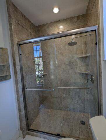 This sleek shower upgrade features a seamless base and smooth Alaskan Ivory wall panels that extend to the ceiling, creating a bright and cohesive look. The new sliding glass enclosure adds a modern touch while maximizing space. Inside, two corner shelves offer convenient storage, and the brushed nickel fixtures including a round overhead showerhead and single handle control enhance both function and style. The transformation focused on simplicity and elegance, replacing the previous setup with a refined shower experience tailored to the clients’ preferences. The result is a clean, contemporary space that balances comfort, accessibility, and visual appeal.