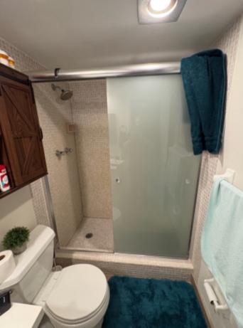 This project features a sleek, high-contrast Shower to Shower renovation that significantly modernizes the original small-tile aesthetic. The dated mosaic tile walls and floor were replaced with elegant Everest colored panels in a Smooth style, which were also used as custom baseboards throughout the room to replace standard white wooden ones per the client's request. The new design includes a matching Left Facing Base and integrated Window Trim to provide a clean, seamless finish around the existing natural light source. To complete the contemporary look, the plumbing was upgraded with a Moen Matte Black Valve and a matching Matte Black Extender for the existing showerhead. The functional upgrades are rounded out with two integrated Corner Shelves, new Trecento flooring, and a Matte Black Straight Tension Rod for a minimalist enclosure, resulting in a sophisticated and cohesive bathroom environment.