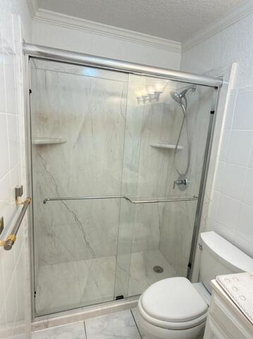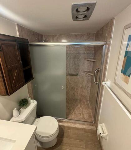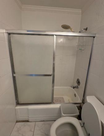 This extensive Shower-to-Shower Conversion involved a full demolition of both the existing shower and the flooring, ensuring a complete renewal of the space. The new enclosure features three walls of sophisticated White Pearl Smooth Walls and a matching White Pearl Base, establishing a bright, elegant, and low-maintenance marble aesthetic. Safety and convenience are maximized with the installation of two Chrome Grab Bars and two integrated corner shelves. The system is equipped with a new Moen Valve and utilizes the customer-supplied shower head for personalized function. The shower is beautifully enclosed by a Semi-Frameless Bypass Door Chrome. To complete the remodel, elegant White Ocean Luxury Vinyl Plank Flooring was installed throughout the room, delivering a seamless, modern, and high-value finish.