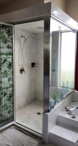 This shower-to-shower remodel, completed without permits, features a fresh upgrade with Azzura Bay wall panels, four corner shelves, and a built-in bench for comfort and convenience. The shower was extended approximately 38" from the original ledge wall, replacing the previous tub layout. Fixtures include a handheld shower for versatile use, all enclosed in a sleek frameless glass system with a hinged door. The project also involved removing the tub, a 24" towel bar, and a ceramic toilet paper holder, with all surrounding walls professionally. Calcutta White flooring completes the transformation, adding a bright, elegant finish to the space.