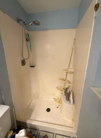 We converted the existing bathtub into a walk-in shower, installing a standard shower base with a left-side drain and smooth Azzurra Bay wall panels across three sides. The remodel includes a brushed nickel Moen Magnetex valve and fixture, paired with a brushed nickel bypass glass enclosure for a sleek, modern finish. Safety and convenience were enhanced with two corner shelves, a shampoo caddy, and a 24" safety grab bar. All debris was removed upon completion, leaving the space clean, accessible, and beautifully updated.