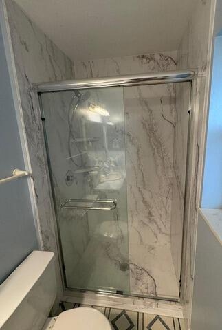 This transformation replaced a traditional bathtub with a low-threshold shower base, enhancing accessibility and modernizing the space. The shower walls were upgraded to Calacatta White panels with a smooth finish, extending across three walls and up to the ceiling for a seamless, elegant look. Matte black fixtures, including a Moen Magnetix handheld shower and Posi-temp valve, were installed along a tension-mounted rod enclosure. Functional accessories such as a built-in bench, corner shelves, and a safety bar were added for comfort and convenience. The renovation also included new flooring, a mirror replacement in the secondary bathroom, and thoughtful layout adjustments tailored to the client’s needs.