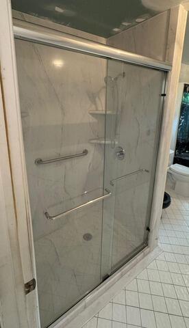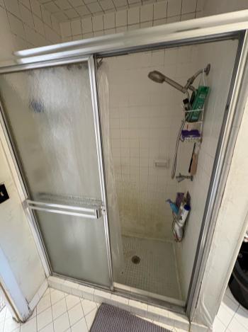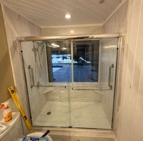 This shower remodel combines refined aesthetics with personalized upgrades. The walls are finished with White Pearl Sim Tiles installed at 3/5 height, reaching 96” for a clean, spa-inspired look. At the base, a custom extra-large center drain ensures smooth water flow while complementing the tile design. Four corner shelves offer practical storage, and the bench originally planned as a corner seat was upgraded to a fixed bench for added comfort and stability. A window kit brings in soft natural light, enhancing the sense of openness. The shower system features a bronze cradle and slide bar, paired with a dual water dial for seamless control and a tailored experience. The enclosure is completed with a bronze panel and hinge door, adding warmth and contrast to the pearl tones.
