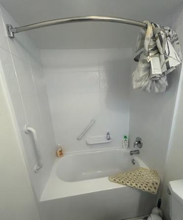 This bathroom featured a traditional tub with dated tile and a basic shower curtain setup. The space felt tight and dark, with limited accessibility and visual appeal — not ideal for everyday comfort or ease of use.