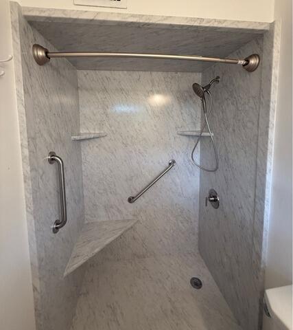 We replaced the tub with a sleek walk-in shower featuring elegant marble-look wall panels, a clear glass sliding door, and a modern handheld showerhead. The addition of integrated corner shelving and a polished grab bar brings both function and safety to the