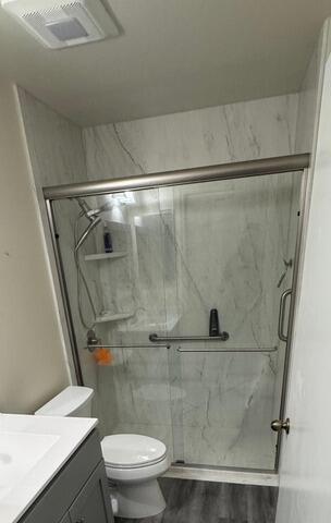 This bathroom renovation showcases a cohesive and elegant design featuring Azzurra Bay panels on both the walls and floor, creating a seamless and modern aesthetic. The shower is equipped with a Moen Posi Temp valve and a dual shower head system, both in Brushed Nickel, offering enhanced functionality and a refined finish. Two corner shelves provide practical storage, while 12" and 24" grab bars ensure safety and support. The space is enclosed with a semi-frameless glass door in Brushed Nickel, completing the look with a clean, contemporary touch. This remodel balances comfort, accessibility, and visual appeal in a beautifully unified design.