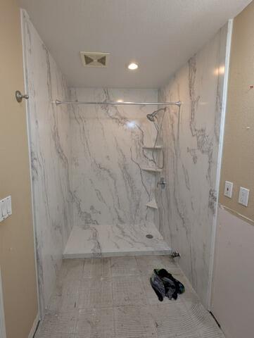 The outdated bathtub was replaced with a sleek shower base, framed by three walls of stunning White Pearl Smooth panels, providing a high-end, low-maintenance marble aesthetic. This renovation is designed for modern usability, incorporating essential shelves and the unique addition of a Shave-Step for comfort and utility. Utilizing two extra panels to ensure complete, seamless coverage, the system features an updated Moen Magnetix-C trim and is finished with a standard tension rod ready for your favorite shower curtain.