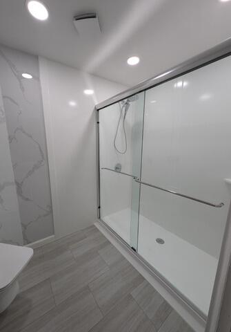 This sleek shower upgrade features a seamless base and smooth Alaskan Ivory wall panels that extend to the ceiling, creating a bright and cohesive look. The new sliding glass enclosure adds a modern touch while maximizing space. Inside, two corner shelves offer convenient storage, and the brushed nickel fixtures including a round overhead showerhead and single handle control enhance both function and style. The transformation focused on simplicity and elegance, replacing the previous setup with a refined shower experience tailored to the clients’ preferences. The result is a clean, contemporary space that balances comfort, accessibility, and visual appeal.