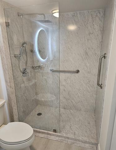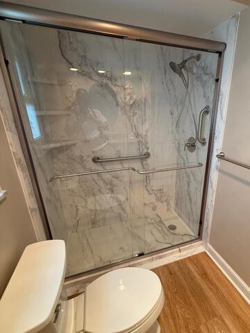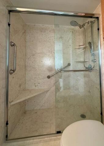 This high-value Tub-to-Shower Conversion delivers a dramatic upgrade in both style and accessibility. The outdated tub was replaced with a sleek shower base, framed by three walls of gorgeous White Pearl Smooth panels, providing a timeless marble look that requires virtually no maintenance. Safety and convenience are paramount in this design, which features an accessible Teak Folding Seat and robust safety bars positioned on the Center, Left, and Right walls. The system is equipped with an updated Moen Magnetix-C trim for enhanced functionality and includes integrated shelving. The enclosure is finished with a simple Tension Rod, completing a highly functional, safe, and luxurious bathing space.