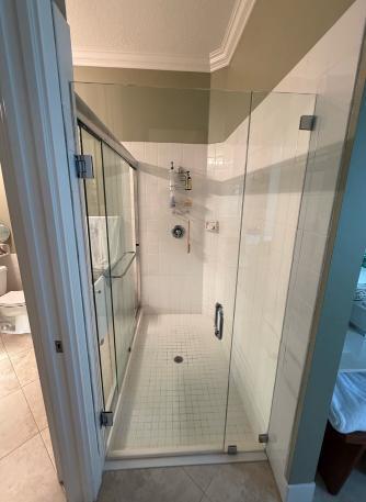This professional bathroom renovation featured a specialized shower to shower conversion with a focus on seamless access and custom engineering. The project includes high-quality wall panels in a bold Azzurra Bay finish, paired with a custom extra-large shower base that was professionally leveled with the bathroom floor for a smooth, flush transition. For enhanced safety and comfort, the layout incorporates two Chrome safety bars (18" and 24") and dual corner shelves for integrated storage. The space is elegantly enclosed by a semi-frameless bi-pass door in Chrome with dual towel bars, and includes a Moen Magnetix showerhead as a premium courtesy upgrade, perfectly combining modern style with a high-functionality.