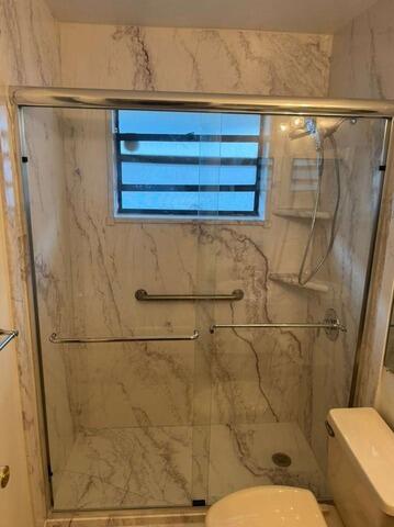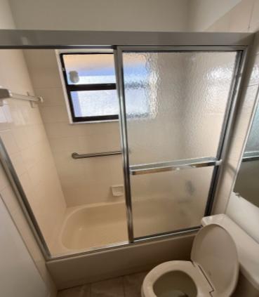 This professional bathtub to shower conversion in West Palm Beach features a clean and modern update to the guest bathroom. The project includes the installation of a matching shower base with a specialized window trim kit for a perfectly finished look around the existing window. For enhanced organization and functionality, we integrated two corner shelves and performed a courtesy upgrade to a high-performance Moen Magnetix showerhead. The enclosure is completed with a 76" high semi-frameless bypass door system featuring dual through-glass towel bars and a sleek Chrome finish. This remodel successfully transitions the space into a more accessible and contemporary environment while maintaining a polished, cohesive aesthetic with all Chrome hardware.