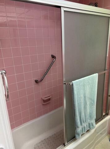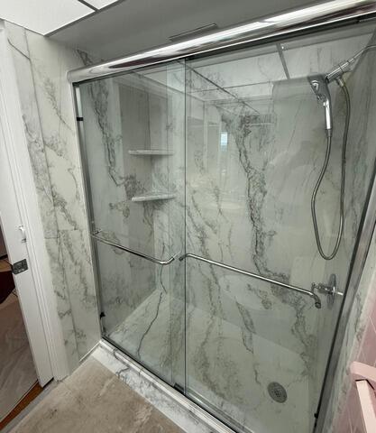 This bathroom underwent a striking transformation, replacing a retro pink tiled tub with a sleek, modern shower. The new enclosure features sliding glass doors and a marble-patterned wall system that extends to the ceiling, creating a clean and elegant atmosphere. A handheld showerhead mounted on a vertical bar offers adjustable comfort, while two built in corner shelves provide practical storage. The brushed nickel fixtures and seamless base enhance both style and safety. This remodel not only updated the aesthetic but also improved accessibility and daily convenience, delivering a fresh, functional space tailored to the homeowner’s needs.